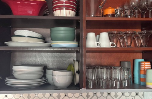 Kitchen is newly made and has all amenities to satisfy your cooking needs. All tools are provided and even a coffee machine to keep your day going. The kitchen has a stove stop and microwave with an overhead kitchen exhaust for when you cook. The oval shape table sits 6 people centered by a tv and 2 leather couches that recline to sit back after a meal or long day and watch tv or movies.