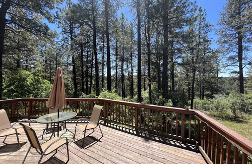 It has a large deck with bird feeders that attract many different birds, including Humming Birds.