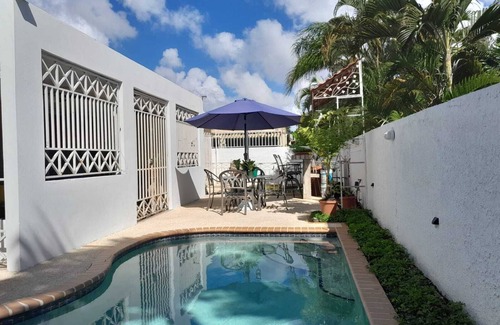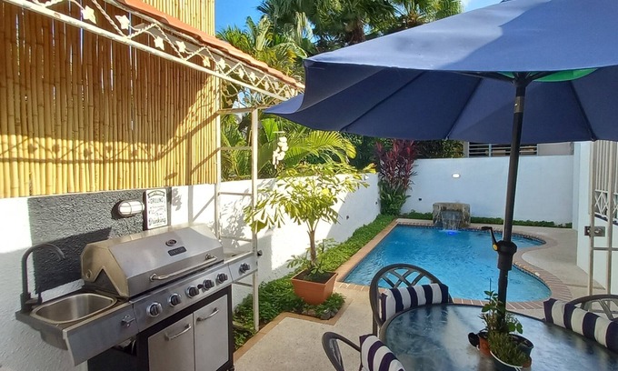 Enjoy at Villa Mifany, 2 rooms, 2 bathrooms w/pivate pool 24/7, outdoor kitchen w/top stove, sink & BBQ. Separate from the main house, independent entry, self check-in with lockbox. A/C, Wi-Fi, TV, full & queen bed, hot water, refrigerator, microwave, rice & coffee maker, patio set table 4 chairs and umbrella, living and dining area, gardens, fish pond and 2 parkings, in a quiet gated community. Max 4 guests. Smoking area, daily maintenance of outdoor areas.