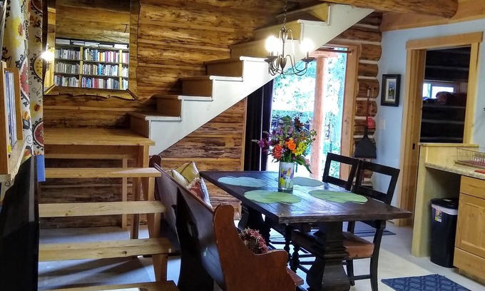 If you are looking for a nature filled scenic get-a-way, or working getaway, come stay with us in our charming guest house log cabin, set on 25 acres on the edge of Lolo National Forest. Enjoy "forest bathing" (taking a walk in the woods), and rewild yourself. Complete with the sounds of a creek, a fire circle, lots of places for hiking and right on a forest service road for snowmobiling and hiking. Cell coverage is spotty up here in the mountains, but we do have internet. We are pet friendly. Our farm has gardens, goats, free range chickens (please keep fido on a leash), barn cats, and a beautiful golden retriever. Please, no parties and no recreational drugs.