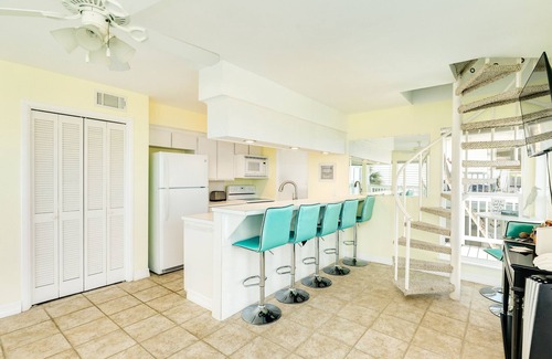Inside, the main level of Sunshine Beach features a well-equipped kitchen with all of the pots, pans, dishware, utensils and glassware you need for relaxing meals at your home-away-from-home. The bar-height dining table seats 4, and additional seating is available at the breakfast bar. Walls of windows and sliding glass doors let in plenty of natural light and showcase great Gulf views.