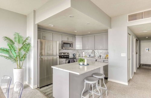 Modern, fully-equipped kitchen with stainless steel appliances and an island with bar seating