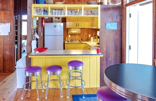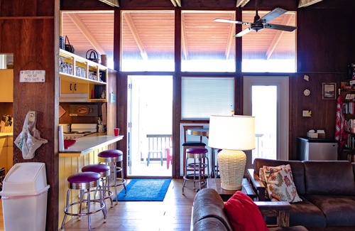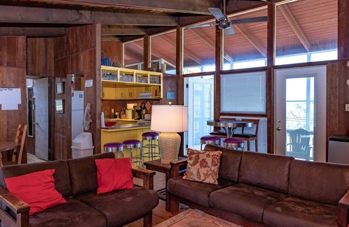 Cathedral ceilings and large windows provide an open, outdoorsy feel. Rough cut cedar walls and pine floors throughout. Living area opens up to a screened breezeway. The breezeway has wonderful sea breezes and shady areas throughout the day. Plenty of deck furniture makes it a wonderful place to gather. Master Bedroom/Bath (QB) is off the main living area. Bedroom 2 (QB) and Bedroom 3(2 sets of twin bunks) and 2nd bath are separated from the main part of the house by the breezeway. There is also an ocean side sun deck with a table and chairs and umbrella. It is a great place to sunbathe, and is shady and cool in the evenings.