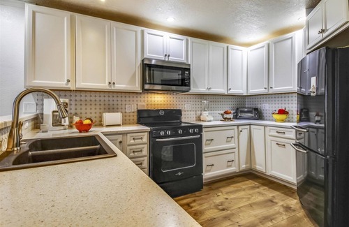 Head back toward the entry hall and discover the master bedroom which holds a plush, king-size bed, reading chair, and large, flat-screen TV. A finely-crafted, sliding barn-wood door will lead you into a roomy walk-in closet which also serves as the entrance to the full, master bedroom—complete with a shower/bathtub combination. Step outside the master bedroom and make your way toward the living room; on your left, you’ll find thesecond bedroom. This lovely room also features a king bed as well as tworeading chairs, and direct access to the full, hall bathroom.