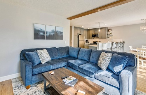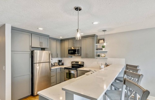 Meander through the hallway and come to the ample main living area. On your right, you will enjoy a family room built for comfort with a luxurious L-shaped couch, fireplace and hearth, and a large, flat-screen TV (set up with Netflix and Disney +). Turn to your left and take in Sandcastle’s elegant kitchen. Fully stocked, spacious, and finished with flawless quartz countertops and a breakfast bar, the family chef will find themselvesin a little slice of Heaven as they dish out delicious fare. Break out the kids dishes provided for your family, and they'll feel right at home. Just off the kitchen lies the dining table where meals, games, and stories can be shared while basking in a beautiful view of shimmering trees, just outside.