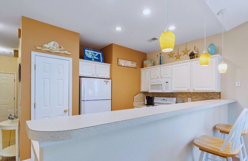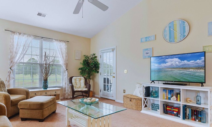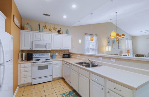This condo is perfect for your golf and beach vacation! Located on second level this 3 bedroom/2 bath condo in the Sandpiper Bay Golf community is a serene spot with golf course views and close proximity to Sunset Beach. The open concept floor plan allows for entertainment enjoyment throughout with interconnecting kitchen/dining/living areas. There are water/fairway views from the common areas of the condo as well as the master bedroom. A screened porch adjoins both the living room and master bedroom offering the perfect space to enjoy morning coffee or an afternoon beverage while enjoying the view. The spacious kitchen is fully equipped with everything needed to prepare meals to enjoy with friends and family. The dining area has seating for six with additional seating at the raised kitchen bar for two. The large living room area has a large screen television and comfortable furniture with coastal vibes. The master bedroom has a king bed, television, ceiling fans and a private full bath. The front two bedrooms each have a queen bed and access to a shared full bath in the entry hallway of the condo. The condo has central heat & air and a laundry area with full-sized washer/dryer. Located only minutes from Sunset Beach and a multitude of area golf courses this condo offers the best of everything for a perfect golf/beach vacation experience. Community outdoor pools, hot tub, charcoal grills and picnic tables are located throughout the condo complex. Complimentary linens, towels and departure cleaning service are included.