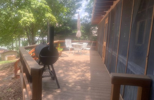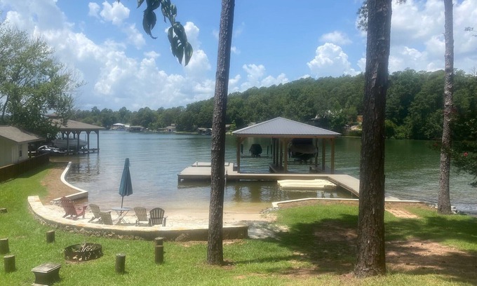 This is a two bedroom one bath cabin and fully furnished with Bobby McAlpine inspiration. It is only 25 minutes from Auburn so is an ideal location for football fans to stay. It has a waterfront beach area, private pier, seadoo docks and a floating dock that floats nearly year round. It is located in a very popular area but is secluded and located in a cove with little boat traffic. You will have spectacular lake views whether lakeside, on the deck grilling or relaxing on the screened porch complete with a hammock, swinging bed, and futon. The master bedroom has a king size bed and the guest room has two bunk beds. Additionally, during the warmer months the screened porch is popular with the kids for sleeping.