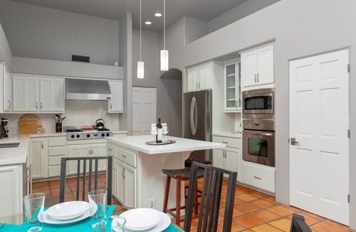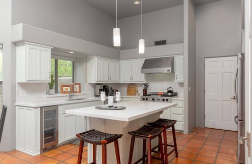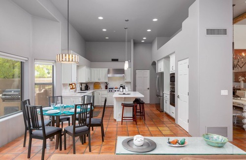 Tennis or Pickleball anyone?! A newly built regulation-sized tennis court with pickleball lines and a basketball hoop sets our Courtside Villa property apart from the rest! Together with the heated pool & spa, built-in BBQ and two outdoor fire pits, this home has exceptional outdoor living space from which to enjoy the great Arizona weather. This fresh feeling home has been newly renovated and has all new transitional, comfortable furniture throughout. The newly renovated kitchen (2024) is equipped to prepare any size meal with dishes, bake ware, small appliances, serving pieces and lots of extras including a beverage refrigerator. Top quality pillow top mattresses and luxurious 660+tc hotel quality linens ensure a great night's sleep in any of the 4 bedrooms (3 King beds, 1 Queen bed). If additional sleeping space is needed, we also provide a Queen size and/or Twin size EZ Bed, which are both raised inflatable beds on frames at a normal bed height.