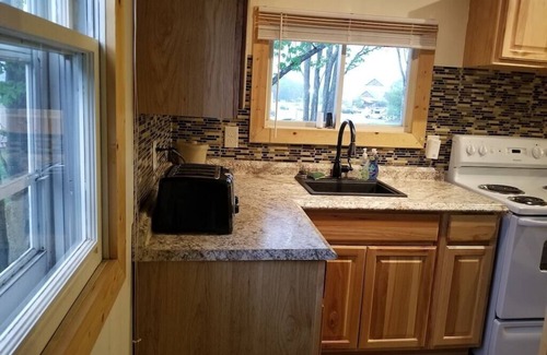 This home is 2 separate listings that we have combined into one to offer a location for larger groups that would like to have at least 2 bathrooms and more beds for their stay. This rental does not include Santa's Shack Studio unit located on same site. We added an on demand water heater so nobody has to dread taking the last shower in a large group, lol. The home is heated by natural gas wall heaters that do get hot to the touch, so please be careful with young ones. This home has 3 bedrooms. Bedroom 1 is upstairs with a queen bed. Bedroom 2 is upstairs with a queen bed and a full on bottom/twin on top bunk bed. Bedroom 3 is downstairs with a queen bed and a private entrance to bathroom 2. The downstairs living room also has a queen sofa sleeper.