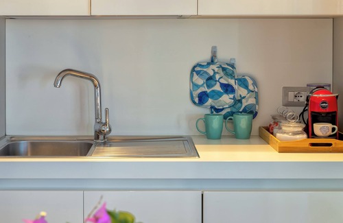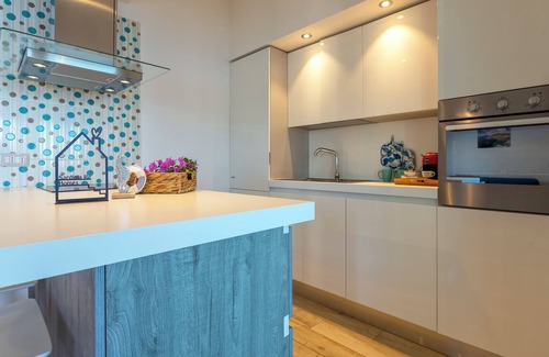 Fully equipped kitchen with modern appliances, ideal for preparing local dishes while admiring the bay view.