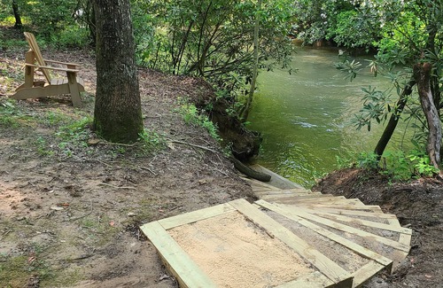 Escape to the serenity of a secluded cabin right on a clear mountain river. Hear the soothing sounds of the rapids as you sit on the deck and eat a meal, cozy up by the outdoor fireplace, or relax in the large hot tub. The short winding stairs will bring you right into the small river so you wade in or try your fishing luck in the famous Fightingtown creek.