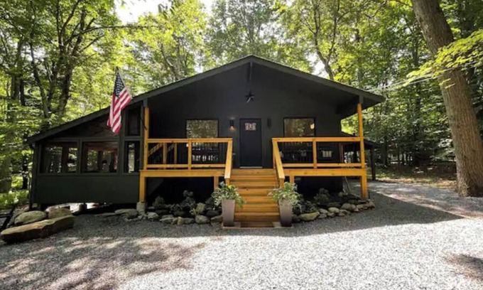 Saturdays cabin has been curated for you to sit back and relax in your cozy and stylish space, in the beautiful Locust Lake Village at the heart of Pocono Mountains. Your pet friendly 2 bedroom and 1 bathroom paradise has all the modern amenities your vacation requires. You’ll enjoy a modern kitchen, movie night on the 55” smart TV, reading a book or playing games on the screened-in porch, soaking in the hot tub, swinging in your hammock, or storytelling with s’mores over the firepit.