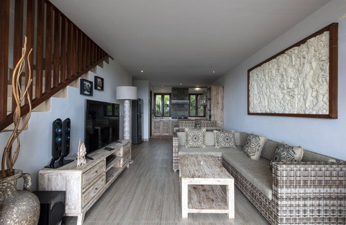 The open plan living area is outfitted with comfortable furniture and TV with international channels, DVD. The sliding doors open out to the infinity pool with views overlooking the rice fields.