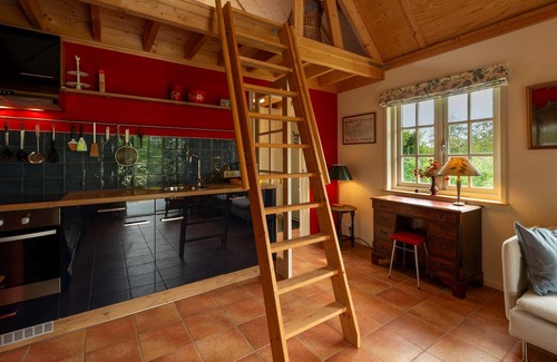 The sleeping area with a double bed is located on the loft, which you reach via the staircase in the living room. Please note, this is a steep staircase!