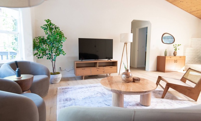 Easily access this stylish home through a keyless entry smart keypad. You'll enter to an open floor plan living room and dining room with stunning wooden high ceilings and skylights that bring in loads of natural light. The living room has a 55-inch Smart TV with apps for Netflix, Hulu, Disney +, Apple TV+, HBO Max, and more. Vacation in comfort with high-speed wi-fi and centralized A/C and heating.