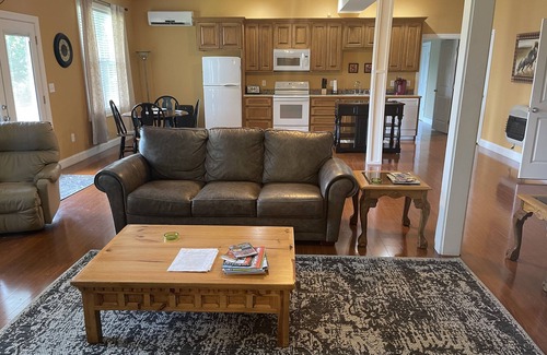 Waze navigation app is the only GPS (that I know of) that will bring you to the house. Once on Stepp Acres Lane make sure to turn right immediately after passing the 3rd mobile home. There is a green sign for #216 and a dumpster on your left. There will be another green sign (#216) directing you up the hill towards a brick house. Turn left in front of the brick house. This is our driveway. Directly after passing the metal shed on your left you will see a graveled parking area. This is where you will park and walk through the yard to enter the downstairs living area.