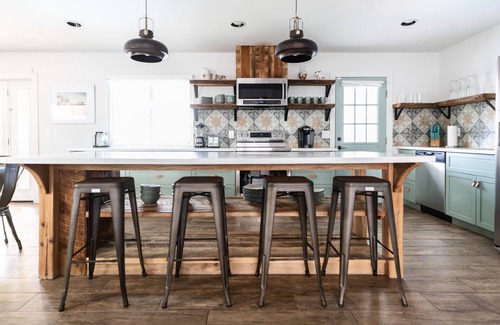 The master bedroom has a king-size bed with an attached bathroom and a smart TV. The second bedroom can accommodate four additional guests in one queen size bed and a trundle bed with two twin mattresses. The third bedroom has two queen size beds to accommodate an additional four guests. The entry room slides closed via the barn door to create another bedroom space, where there is an oversized queen size sleeper sofa to accommodate two additional guests. There are two full bathrooms. There are plenty of mirrors throughout the house (that are conveniently placed next to outlets) so that there is plenty of space for large groups to all get ready at the same time if needed. There are also full-length mirrors in every bedroom.