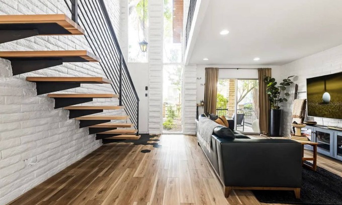 This spacious mid-century loft features, 30ft floor to ceiling entryway, with a wonderful layout. The living room equipped with 75" Smart TV with Premium Cox Cable, Netflix, YouTube and Amazon Prime. Open dining area with comfortable seating for (4) with access to entertaining back patio.