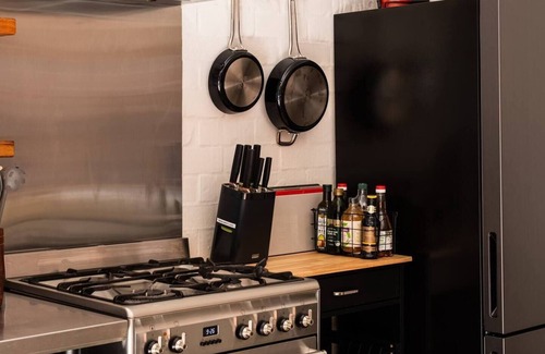 The kitchen is fully equipped with modern appliances, including a dishwasher, Smeg stove and oven, refrigerator and microwave. The kitchen island ends with 4 bar stools for indoor dining.