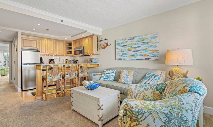 With a king bed and queen-sized sleeper sofa, this cozy little one-bedroom condo can accommodate up to four guests with ease. Throughout the interior, pictures of sea-life have been hung to remind vacationers of the nautical history that is prolific throughout the OBX and particularly prevalent in Hatteras. Flat screen TVs adorn both the living room and bedroom to allow for comfy relaxation after a great day at the beach!