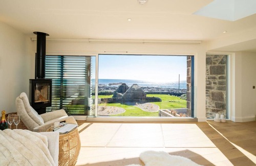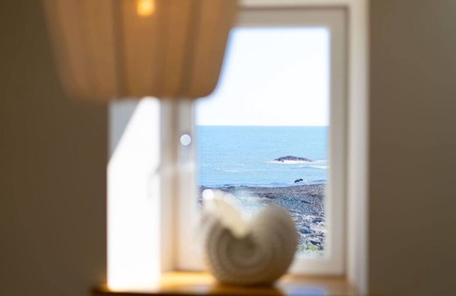 A separate living area can be found on the first floor, where large comfortable sofas invite you to gather around our cosy log-burning fire while enjoying the endless sea views, a favourite spot of our guests in the evenings. Glass sliding doors with Juliet balcony can be opened to further take in the views. We love listening to the crashing waves and enjoying some fresh sea air from this spot. This room has a large smart TV with services such as Netflix and Disney+ available for streaming TV or watching films.
