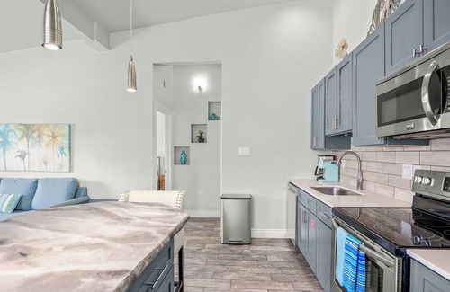Shadow Palm has 8 stand-alone 1 and 2 bedroom villas surrounding a private, resort style pool. Minutes from the beach and close to all of the restaurants, bars, shopping and conveniences of Port Aransas. Villa 8 Sea Mist has a large living room open to a fully stocked kitchen and makes a perfect gathering place. The large bedroom has 1 king bed with high thread count sheets. The living room couch pulls out to a queen bed. The pool area has 3 covered cabanas surrounded by palm trees and other tropical floral. The pool area also includes a covered outdoor kitchen with built-in grills (charcoal). Pets are allowed with some restrictions. Shadow Palm is a new property providing a relaxing private oasis perfect for your beach vacation.