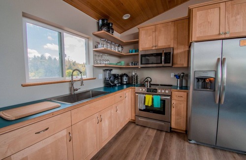 Superb craftsmanship abounds in this bright and cozy tiny home in Tiny Tranquility park looking out onto a stunning Evergreen perimeter. Relax after a day at the beach on some cozy chairs and a sitting area that doubles as a full bed. Enjoy the wood burning stove inside or watch the stars at night from the deck. Cooking galore in a full kitchen, with four burner gas stove, fridge and plenty of countertop. Sleeping includes a queen in a large loft and a full bed on the main level.