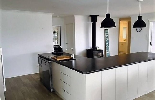 The modern, well equipped kitchen has European appliances including french door fridge, commercial size oven, microwave and dishwasher. There is a spacious breakfast bar and separate dining table within the large open living space.