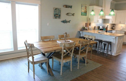 The main floor has an open and roomy feel, making the living room, dining room and kitchen the perfect place to entertain or relax. The home has high ceilings, hard wood floors, crown molding and granite throughout and comes with all the amenities that make for a great vacation home. The home sleeps up to 6 adults or 10 total guests comfortably within it's two bedrooms and third hallway "bunky" room. It has two full baths on the upper bedroom level, a half bath on the main living level and a fully-enclosed outdoor shower on the ground level. For 2023, there is a brand new, 29" barrel charcoal grill/smoker for guest use on the ground level, perfect for preparing lunch or dinner meals. With a built-in table and bench also on the ground level, a giant patio with seating for 10 on the main level and a balcony with 4 more seats, this home truly has outdoor living in mind.