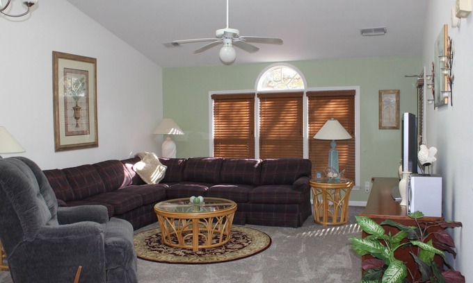 This spacious one bedroom, one bath, second floor vacation rental includes a king bed and 1100 square feet of living space. It is a mile from Sunset Beach and between Wilmington, NC and Myrtle Beach, SC. The villa overlooks the scenic Maples course--one of three signature golf courses at Sea Trail Resort.