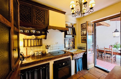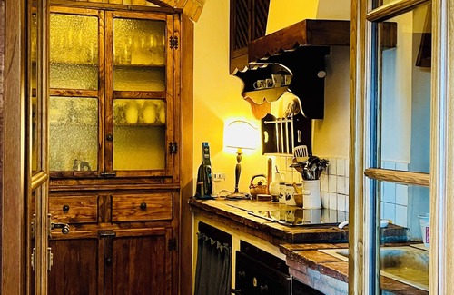 On the ground floor: living room with open fireplace, TV w/Netflixt & DVD, CD stereo; smaller living room with comfortable queen-size sofa-bed (can be a walk-through bedroom if needed) and guest bathroom; well equipped kitchen; adjacent porch with wood oven/grill and dining table for 8 people; large cellar with rock walls, wine barrels and a stone sink.