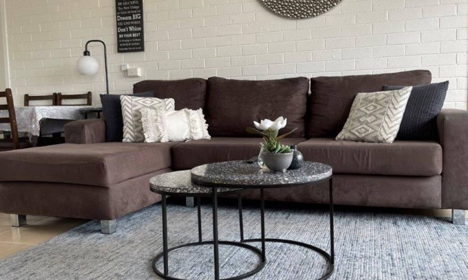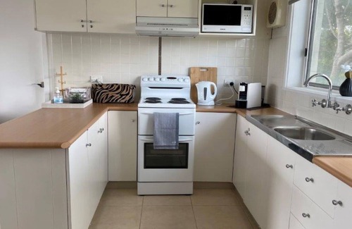 The L-shaped lounge is new and very comfortable to relax in whilst watching the large flat screen tv or dvd. The unit has electric bar heater. Electric cooking appliances, microwave and even coffee pod machine, along with everything else needed is in the kitchen, which has a breakfast bar with 3 stools.