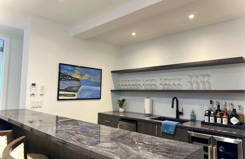 Floor-to-ceiling glass panels blur the boundaries between indoors and out, allowing you to enjoy mesmerizing water views. Relax in the expansive living area or dine with seating for eight while witnessing breathtaking sunsets.