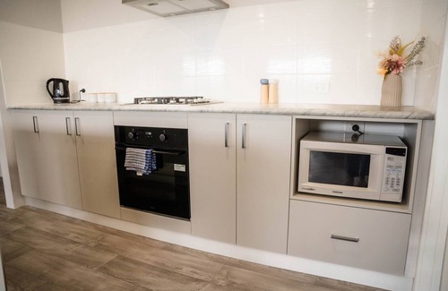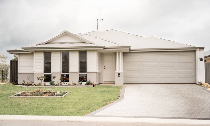 With a focus on families there are toys and activities for the kids and the house is opposite a super size sporting oval across the road, plenty of room for the kids to throw a frisbee or kick a ball. There is also a portable cot with linen and a high chair provided for infants. Manicured parks and play grounds are an only a few minutes walk away. For the Mums and Dads there is a cosy outdoor area with a full gas BBQ and a high bar table with matching bar stools. We even supply a large esky to keep your drinks cold. The home offers a large Smart T.V with an added bonus of a sound bar for your music and there is WiFi to tie it all together, while you sit on the comfy leather chaise lounge suite. The bedrooms offer sliding mirrored robes and drawers for storage and the master bedroom offers a large walk in robe and a well appointed ensuite with a separate toilet. The main bathroom has a deep bath and a separate glass screened shower. Fresh linen and towels are provided for all our guests stay. You’ll be delighted with the well appointed kitchen that offers a 4 burner gas hot plate, overhead range hood and an under bench built in oven. The massive pantry has lots of condiments to make it easy to cook up a storm and tea and coffee is provided. There is a built in microwave and dishwasher as well as an air fryer and all the cooking utensils you need to cook up a storm. The large French fridge offers a roomy freezer and plenty of shelving for your cold food items. The spacious dining area boasts a 6 setting dining suite and there are 3 bar stools at the breakfast bar in the kitchen for snacks. The open space living area also has a large reverse cycle air conditioning system for your comfort all year round. The laundry has a large sliding door linen cupboard, a laundry tub and a combination washer and dryer and there’s a wall hung clothes line outside. There is direct entry from the double garage to the house and your cars are secure with a remote control garage door. The house has fully insulated ceilings and external walls, as well as double glazed windows to the front to ensure a quiet living environment. All this is set in beautifully manicured gardens. This lovely home is truly your home away from home. We look forward to being your hosts!