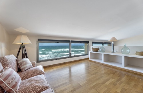Seafront duplex apartment in Can Picafort in in the area of San Bauló, Can Picafort. Spacious, modern, very bright and with stunning sea views. It is a 1st floor duplex with four bedrooms, two living rooms, two bathrooms and a kitchen. The ground floor consists of two double bedrooms, a bathroom with a shower and a bathtub, kitchen with a breakfast bar and a living-dining room with access to a 20 m² terrace facing the sea. The second floor is an clear space with lofted ceilings , on this floor there are two double bedrooms, a living room and a bathroom.