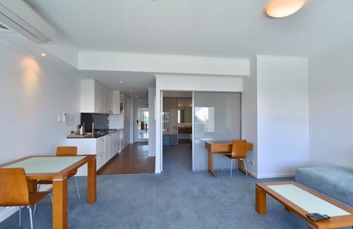 Sea Side 110 is a modern, fully furnished one-bedroom apartment located in the Seashells Tower, Mandurah. The apartment features a spacious balcony overlooking the dolphin pool, a kitchenette equipped with a fridge, microwave, two-burner stove, and dishwasher, and an en-suite bathroom with a shower over the bath. Guests have access to resort facilities, including a swimming pool, tennis court, and BBQ areas. The apartment offers free Wi-Fi, a flat-screen TV, and secure parking. It accommodates up to two guests, with the king bed configurable into two singles.
