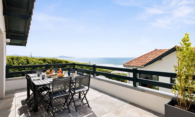 At the end of a cul-de-sac, nestled in a green setting, discover the SEASIDE villa with a capacity for 8 people. With a family home spirit, tastefully renovated, this spacious 170 m² villa with a 50 m² outbuilding will make your vacation in Biarritz delightful. The outdoor spaces are the true highlight of this house. Upstairs, enjoy a beautiful dining terrace with a breathtaking view of the sea. On the garden level, the villa offers you a lovely terrace with an pool (not heated) and a dining area with a plancha.