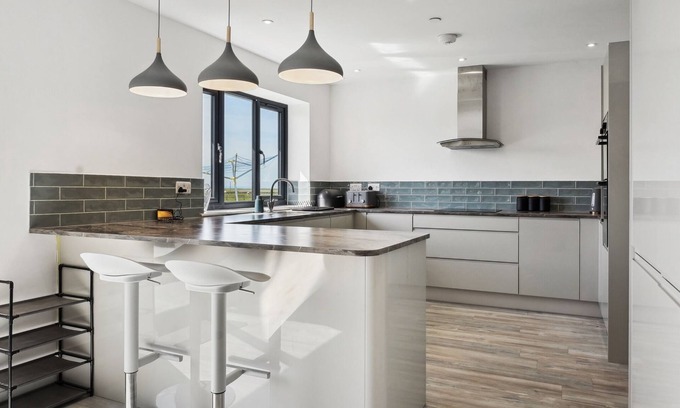 The home benefits from underfloor heating, 5 star insulation properties and modern heat pump technology to ensure a comfy warmth throughout even on the coldest winter days. The easy to use woodburner in the living room also throws enough heat to warm the house throughout. Guests benefit from free logs stored in the outside shed . The open plan living space is light and accommodating enabling the whole family to enjoy using the space at the same time. The modern kitchen ensures all needs are catered for. the adjacent utility room keeps the waste collection and other domestic appliances close to hand.