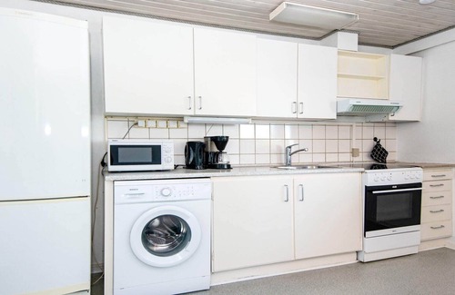 Layout: Kitchen(cooker(electric), coffee machine, microwave, fridge-freezer), Living/bed room(single bed, single folding bed, TV(german television channels, danish TV channels (DR1 and TV2)), chromecast), bedroom(double bed), bedroom(single bed), bathroom(washbasin, shower, toilet)