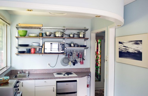 A second floor end unit makes this cozy suite bright. Our space provides beautiful ocean views with the ocean only steps away. Great for winter storm watching or for exploring the calm warm seas of summer. Watch for whales, seals, sea lions and otters swimming by, or look to the air for eagles soaring and kingfishers diving, a true nature lovers delight.