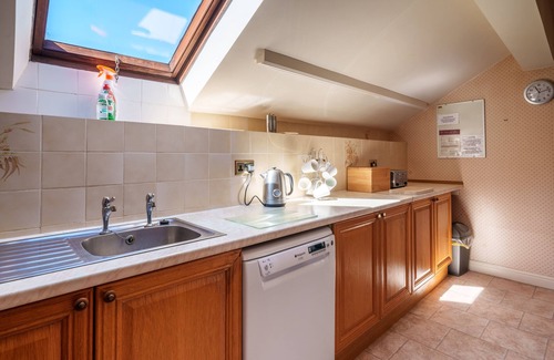 Large kitchen with dishwasher, electric oven & gas hob, large fridge/freezer, toaster, kettle and plenty of cupboard storage.