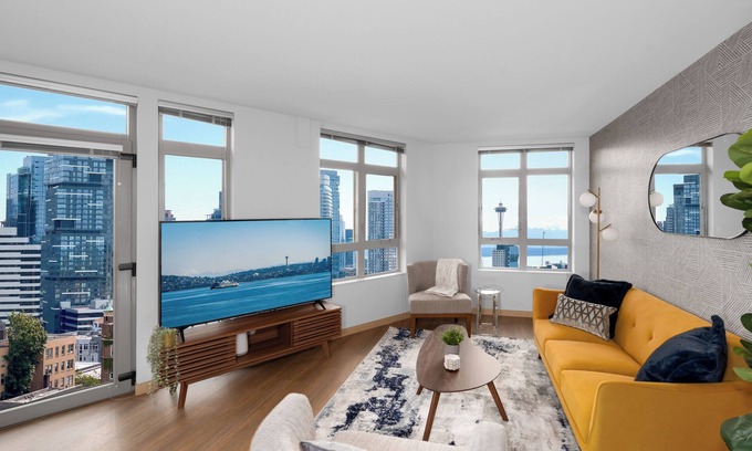 Enjoy this Mid Century Modern urban getaway with rooftop deck and a location in the middle of it all. Step inside, and you will find a bright space with a sleek design and unbeatable Space Needle, Puget Sound & Olympic Mountains view from every window of the Suite. Watch the fireworks on July 4th and New Year's Eve right from the living room or on the rooftop.