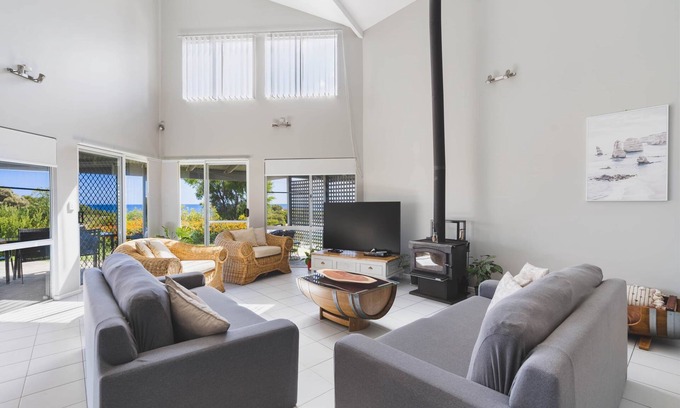 The open plan kitchen and lounge room is designed to maximise ocean views from any almost vantage point. The kitchen is fully equipped, the WIFI is fast, and the 65-Inch Samsung Frame television is loaded with 'pay-TV' international television and streaming services. The fireplace is available for colder nights, but you will more often find yourself enjoying a meal on the sea-facing external patio. The patio is equipped with a BBQ, pizza oven, separate BBQ smoker / fire pit, 7-piece outdoor dining table and additional outdoor furniture.