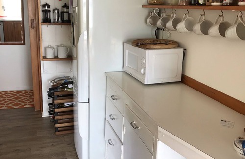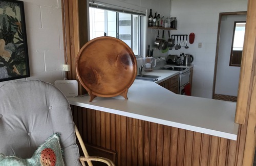 The kitchen is fully equipped with all you will need to make memorable meals. The dining area has a Kauri table and seating for 7 people. Living area has a sofa that seats 3; two swiveling rocking chairs (and an additional one in the middle bedroom that can be brought out) with ottomans and an upholstered cane chair for a comfortable seating total of six adults.