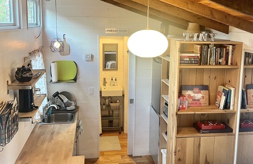 The sleeping area has a very comfortable queen bed with a fluffy duvet. There is a smart TV equipped with Netflix. The tiny home also has fast WiFi as well as a heater and AC so you'll be well equipped no matter the weather. Kitchenette has everything you need to whip up a quick meal!