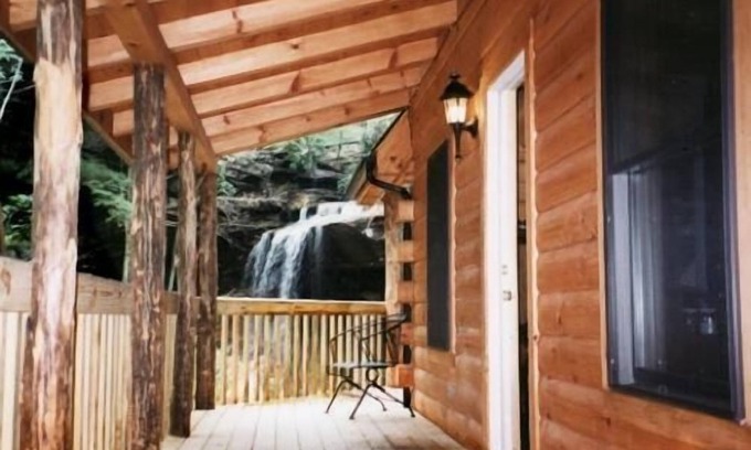 Tranquility Falls is a gorgeous A-frame log cabin with a covered deck overlooking a waterfall tumbling into a ravine. The ravine can be lighted for beautiful night views. Sleeps 2 adults. The cabin has a spiral staircase leading to a loft with a king-size bed and half bath. Downstairs is a queen-size futon for additional guests. Tranquility has a full kitchen, full bath with two person jetted tub, washer/dryer, gas FP, charcoal grill, A/C, phone, satellite TV, DVD, and wireless MP3 speaker for use with your mobile device. Fiber optic wi-fi internet. Front wheel drive recommended for road leading to the cabin. The cabin is on well water and it is recommended that you bring your drinking water. Allows 1 small pet under 25 pounds.