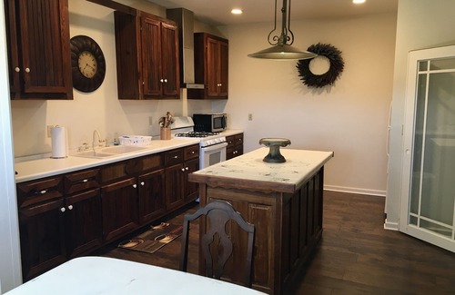 -Kitchen with gas stove, island with two stools, and seating at dinning room table for 7.
