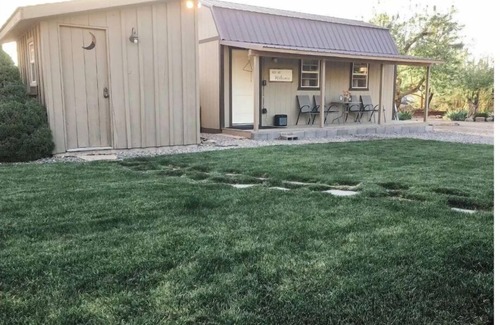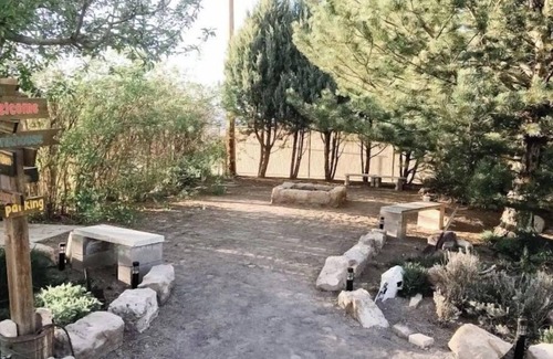 The Bunkhouse has a gathering area downstairs with a dining table, refrigerator, couch, love seat and tv. The upstairs loft has 2 queens beds. The ceiling is low in this loft, but the beds and space are comfy! There is stove but the kitchen is stocked with all appliances you will need to cook. Double hot plate, griddle, skillet, crock pots, toaster, coffee pot, electric kettle, plenty of dishes, pots and pans, spices and even some paper goods. Outside there is a picnic table, BBQ grill, camp chef and fire pit. The porch is so inviting to sit and enjoy the beautiful surroundings and hidden away from anyone’s view.