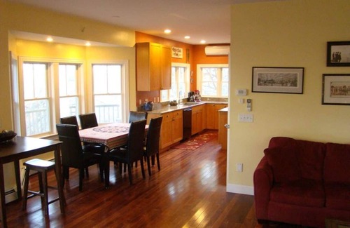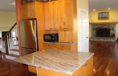 The spacious living room has a fully functional oversize Pennsylvania River stone fireplace, which incorporates the iron mooring rings from the fireplace in the former Moors Restaurant fireplace and a Chinese sandstone hearth. The mantle is a reclaimed beam from an antique Provincetown home. There is an Insignia 50 inch flat screen TV located over the fireplace with surround sound, Ipod/Iphone dock, DVD player, and Wii system for games or Netflix.