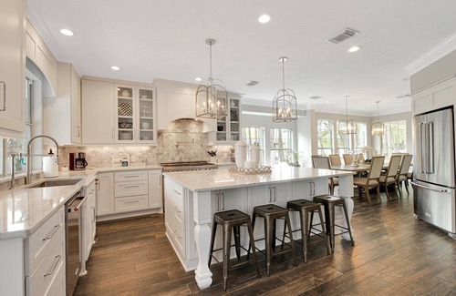 Five star chef style kitchen with beautiful marble, stainless steel appliances, professional range ovens, 6 burner stove, 2 refrigerators, and sonic ice maker.